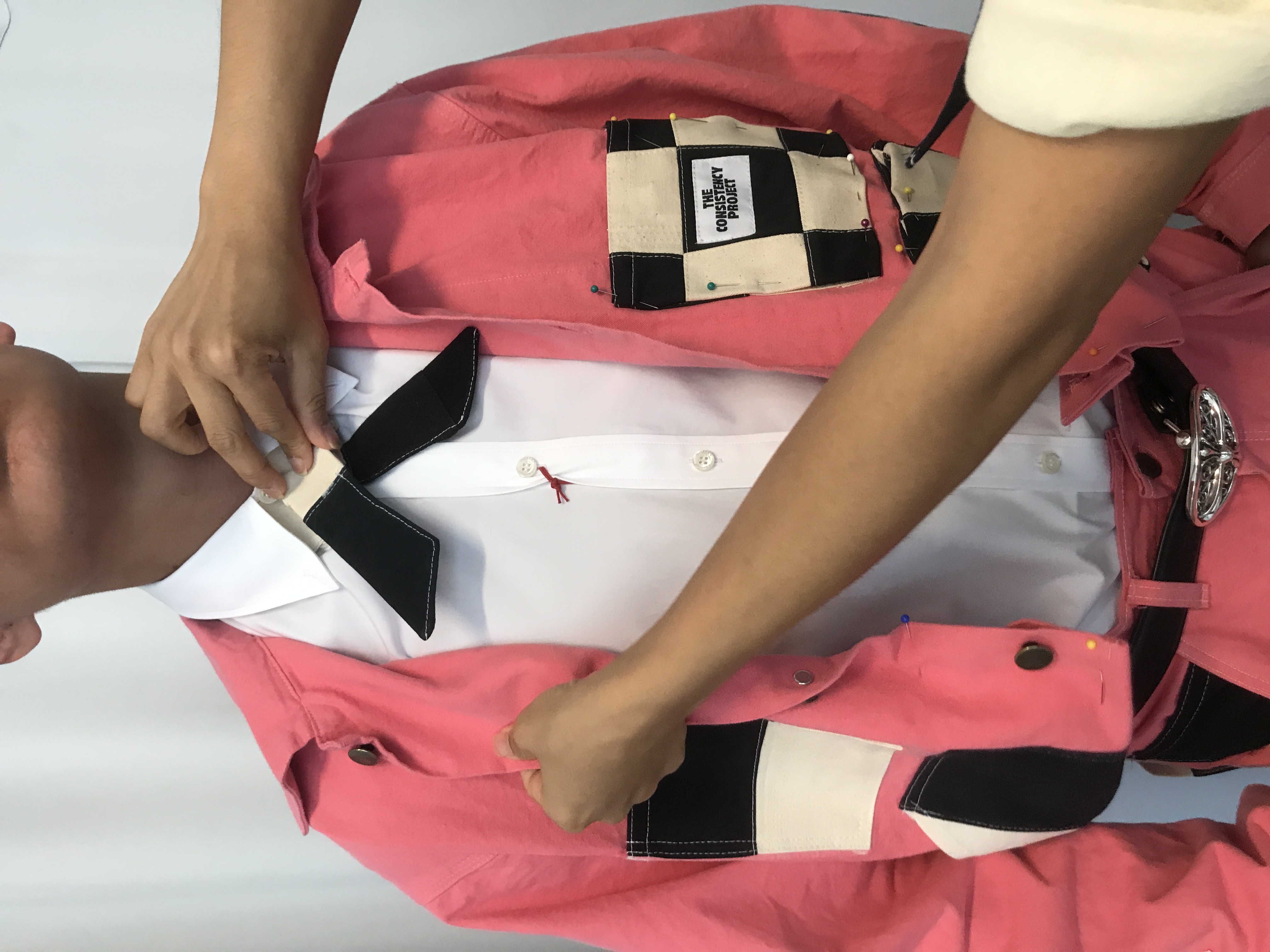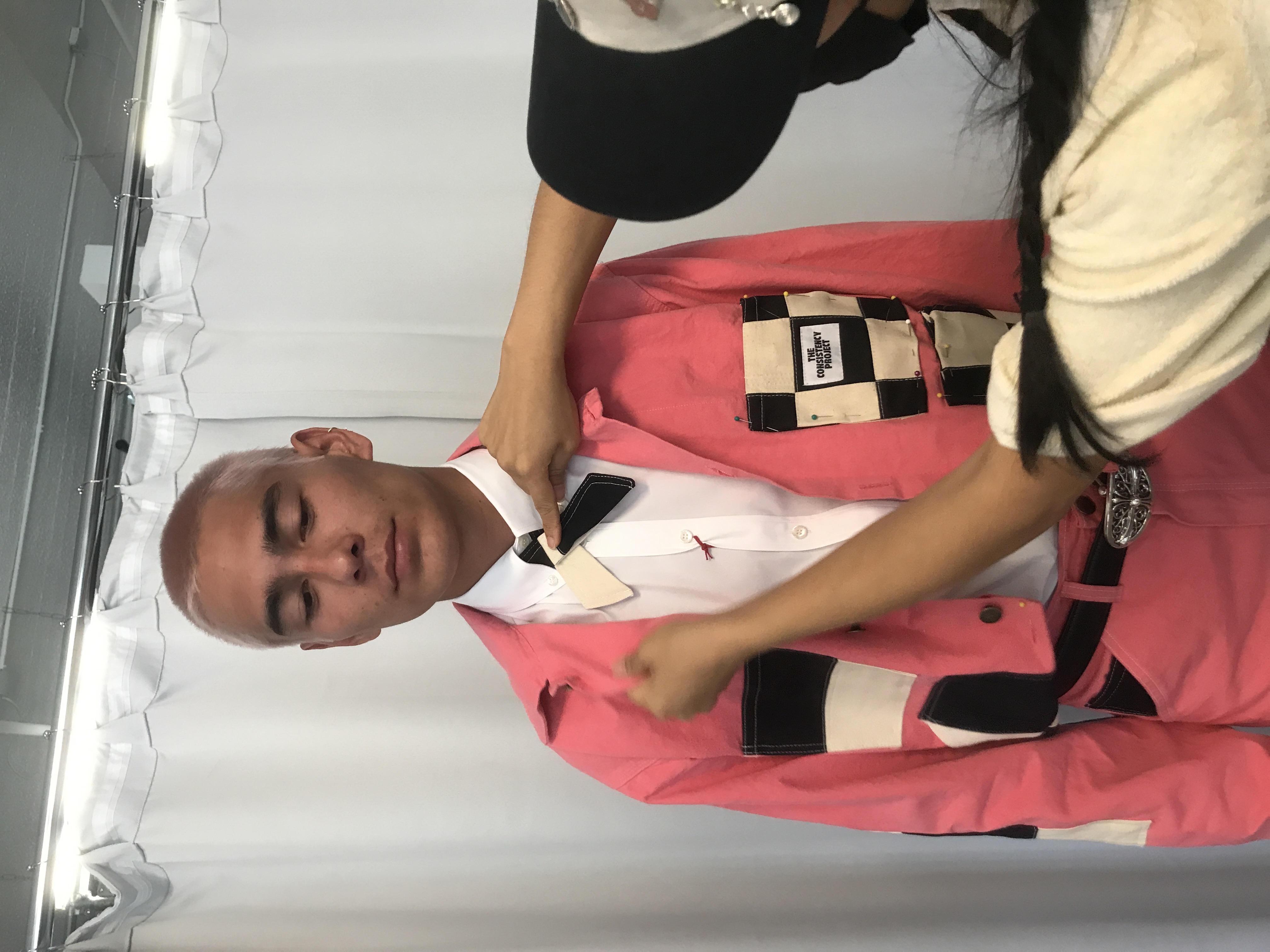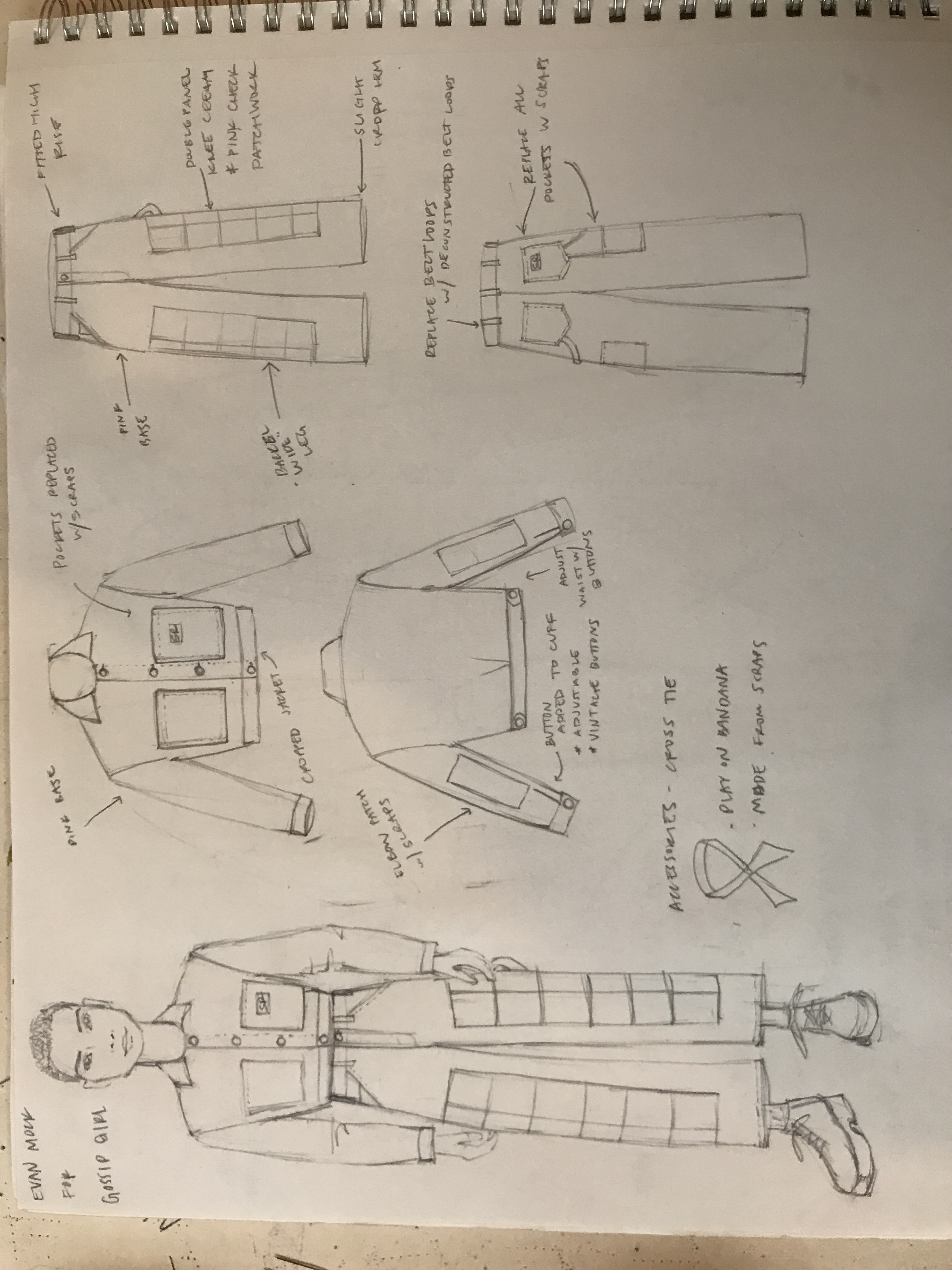 The final look centered on a pair of custom-reworked Stan Ray pants. We transformed the classic work pants into a new, oversized silhouette by widening the leg and adding length to emphasize a modern, baggy streetwear fit. The most striking element of the pants was the vibrant patchwork: a bold mix of hot pink and black-and-white checkerboard, a visual nod to the character's frequently dyed hair and a playful subversion of traditional gender expression in workwear.