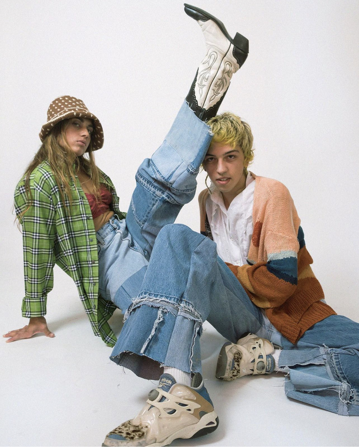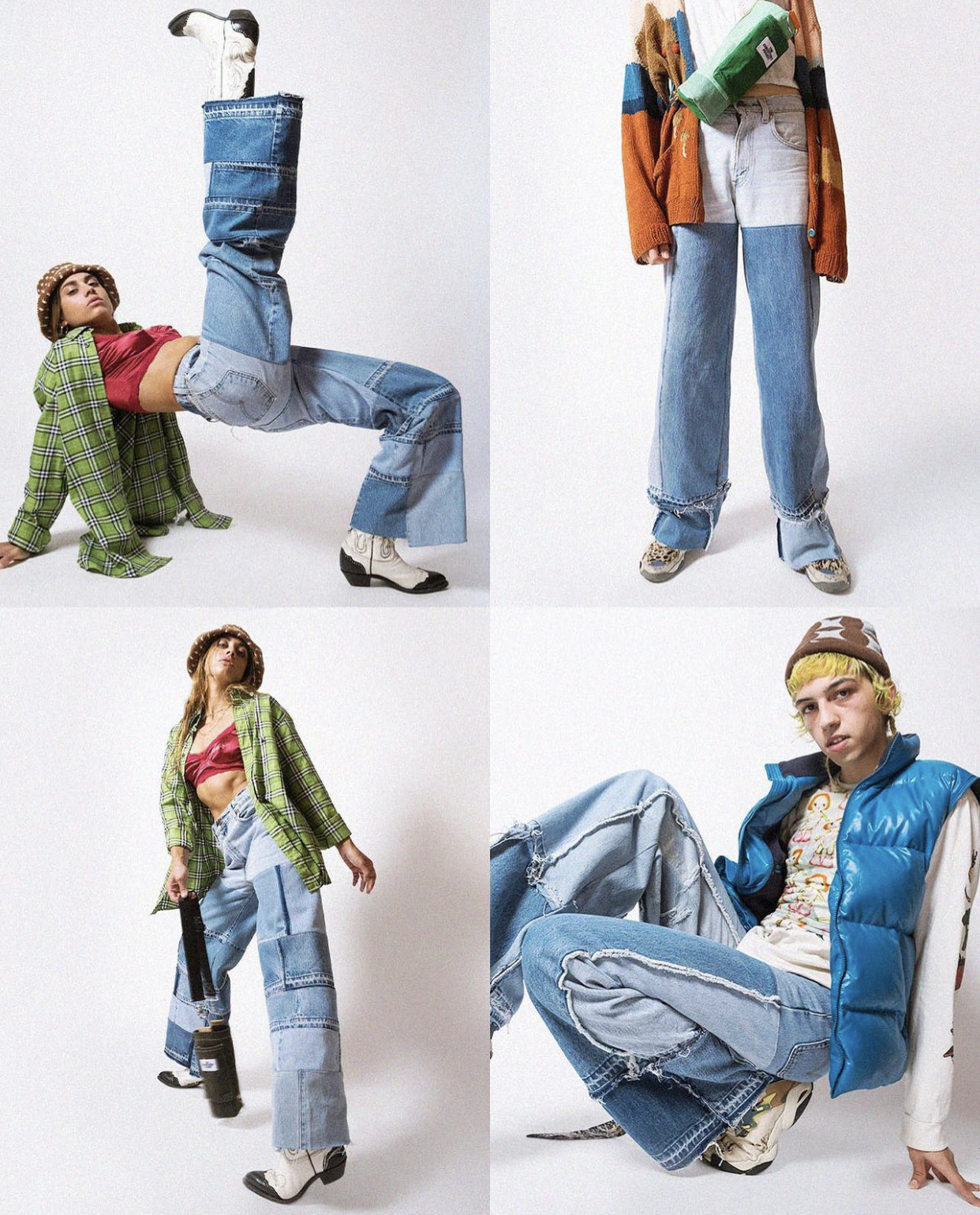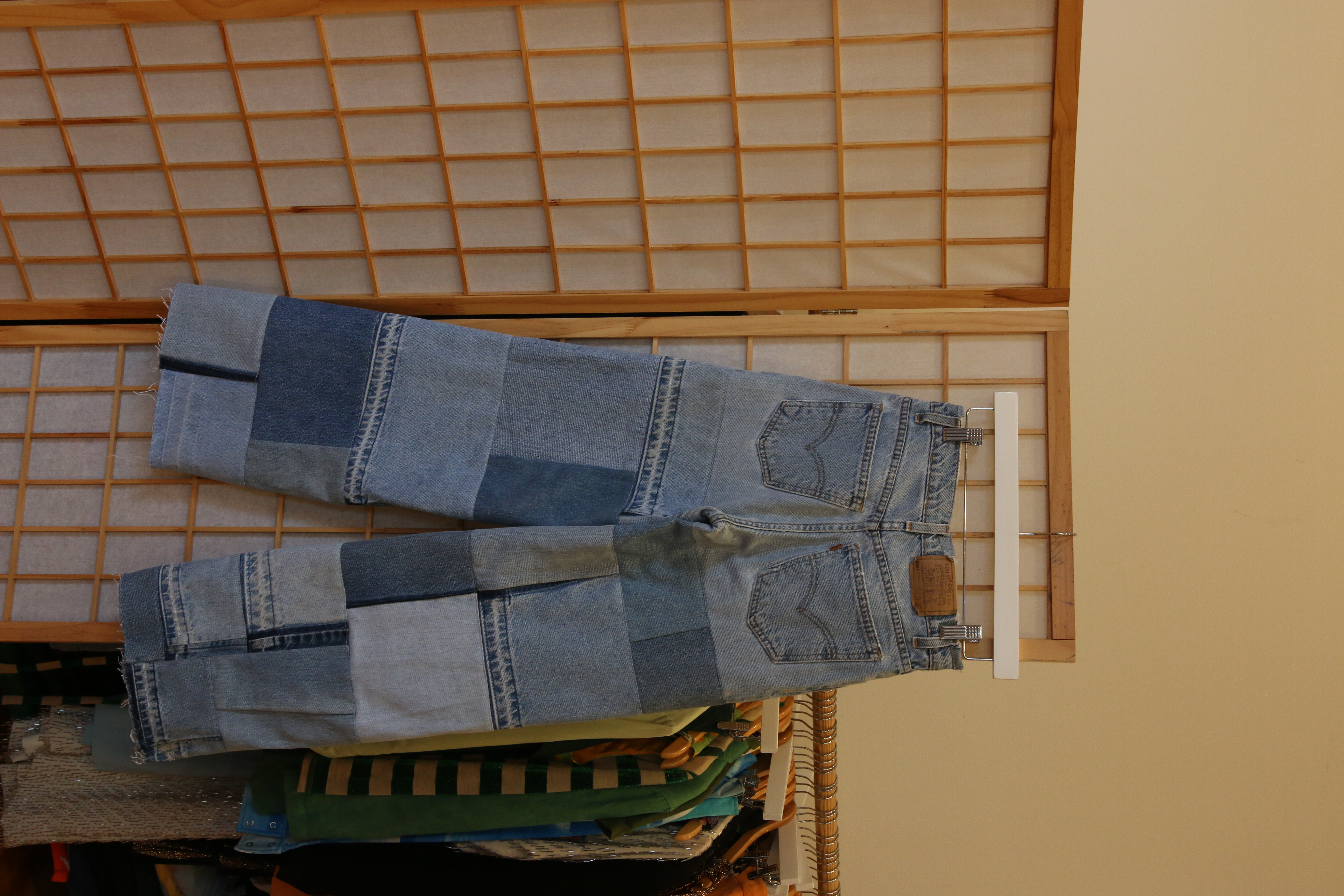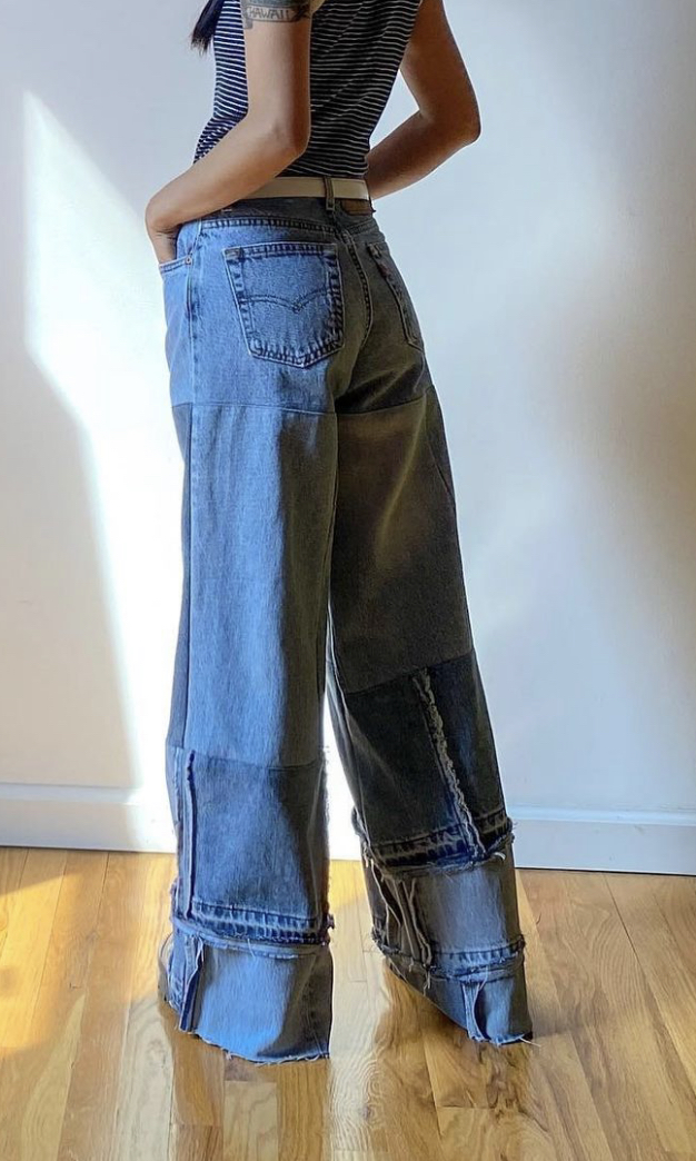 The Reroll Collection showcases a detailed approach to textile craft and custom design. For this project, I collected and preserved all of the denim offcuts from Levi’s alterations. Using a patchwork and quilting-like technique, each small remnant was seam-ripped and meticulously pieced together to form larger, cohesive sections of fabric. These newly created “reroll” panels were then integrated into the design of vintage Levi’s, resulting in distinct straight-leg and wide-leg silhouettes. In addition to the collection pieces, we also created custom designs for individual clients, ensuring each garment was not only unique but also a perfect fit.